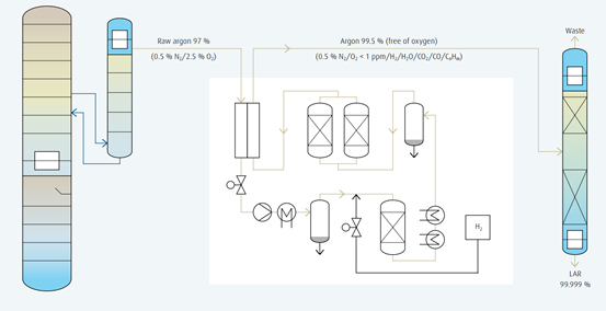Within the so-called argon belly – the area in the low-pressure column where the argon concentration is at a maximum (approx. 10 %) – a gas stream is fed into the raw argon column for further rectification. The remaining oxygen in this gas stream is completely removed in the rawargon column, which is also a packed column. Due to the very low pressure drop in the packing, it is possible to install a sufficient number of