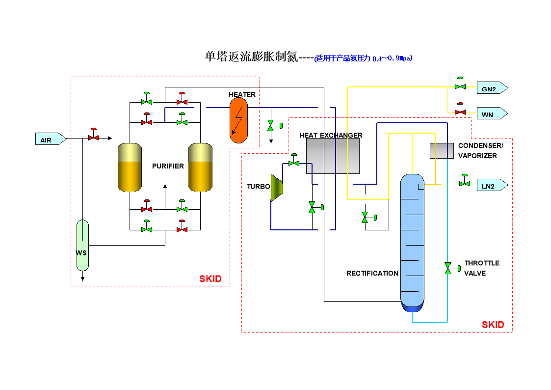 Molecular sieve adsorption, gas bearing turbo-expander expansion refrigeration, single-column rectification, different process forms can be adopted according to the different nitrogen conditions of users to meet the needs of users with different pressure levels of nitrogen, and can also be produced according to user requirements. The amount of liquid products, and strive to yield and purity can meet the needs of users, and the lowest energy consumption.